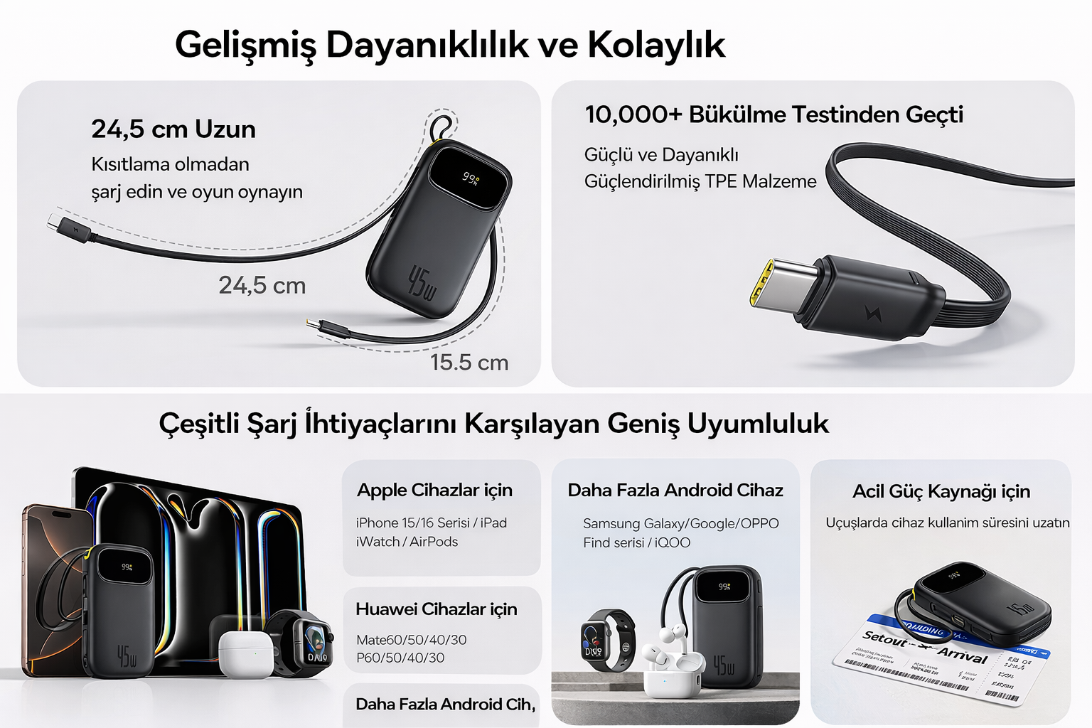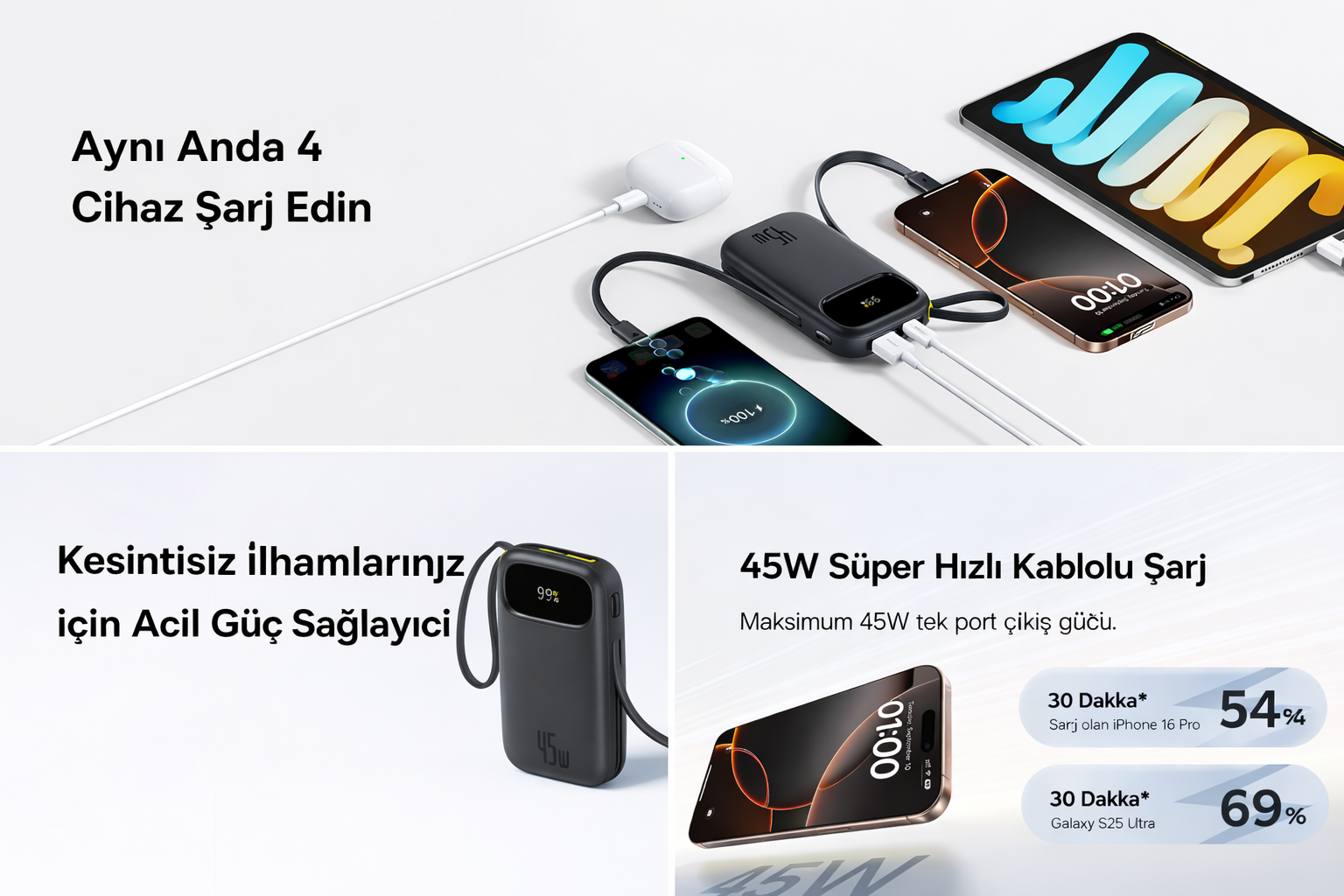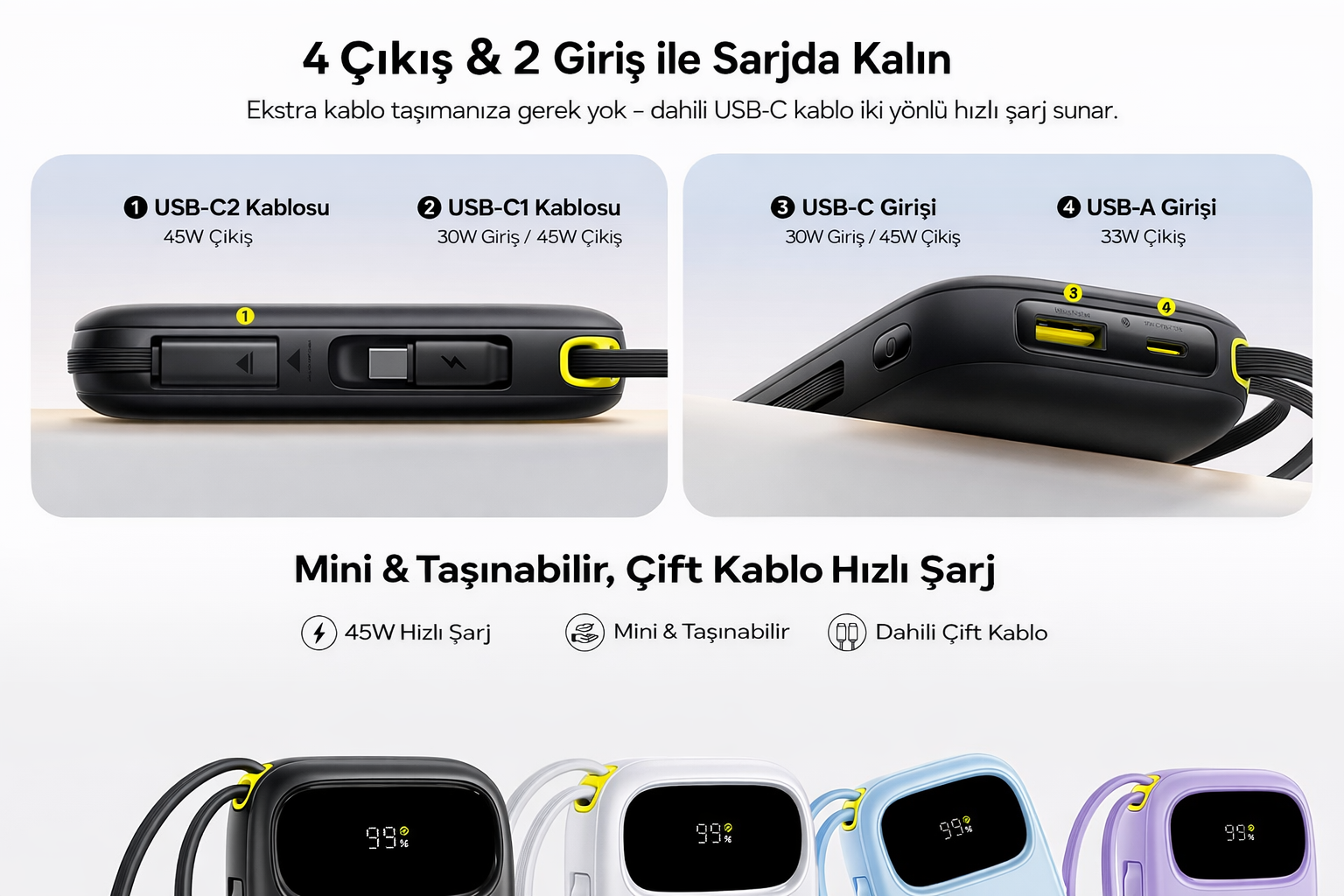 Baseus EnerFill FC31 Dijital Ekranlı Hızlı Şarj Powerbank Dahili Çift USB-C Kablo 10000mAh 45W - Siyah