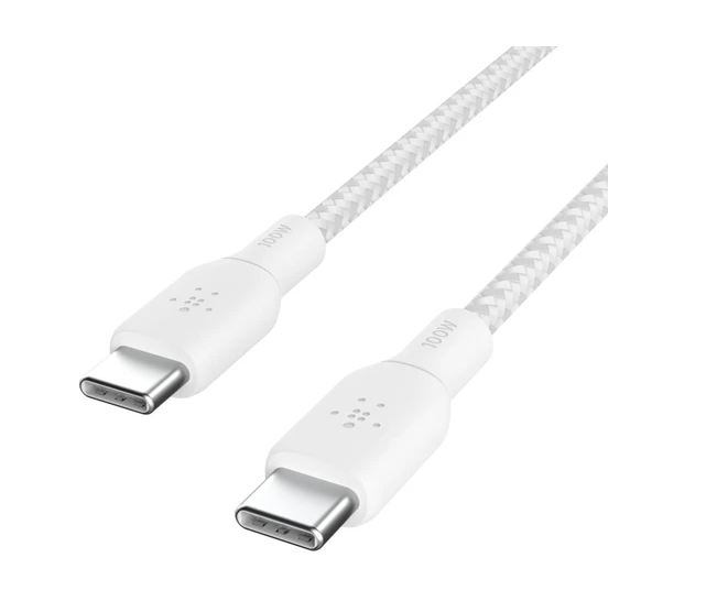Belkin USB-C - USB-C Kablosu, 100 W Güç Dağıtımı iPad Pro, MacBook, Galaxy ve Diğer Aygıtlar için Çift Örgülü Naylon Kılıflı USB-IF Sertifikalı 2.0 Şarj Kablosu (2 m) Beyaz