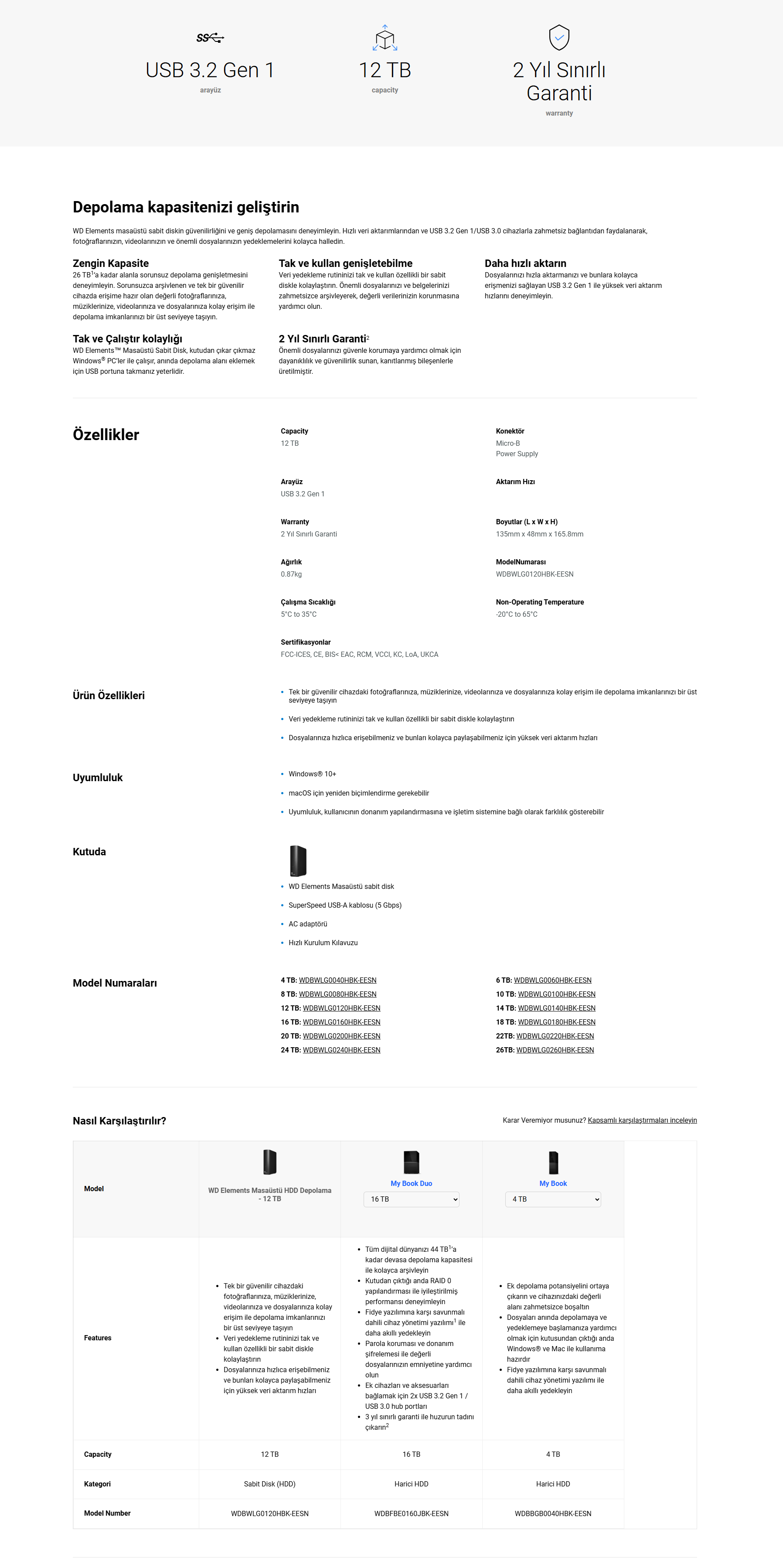 WD Elements 12TB USB3.2Gen1 Masaüstü HDD Disk - WDBWLG0120HBK-EESN (718037872155)