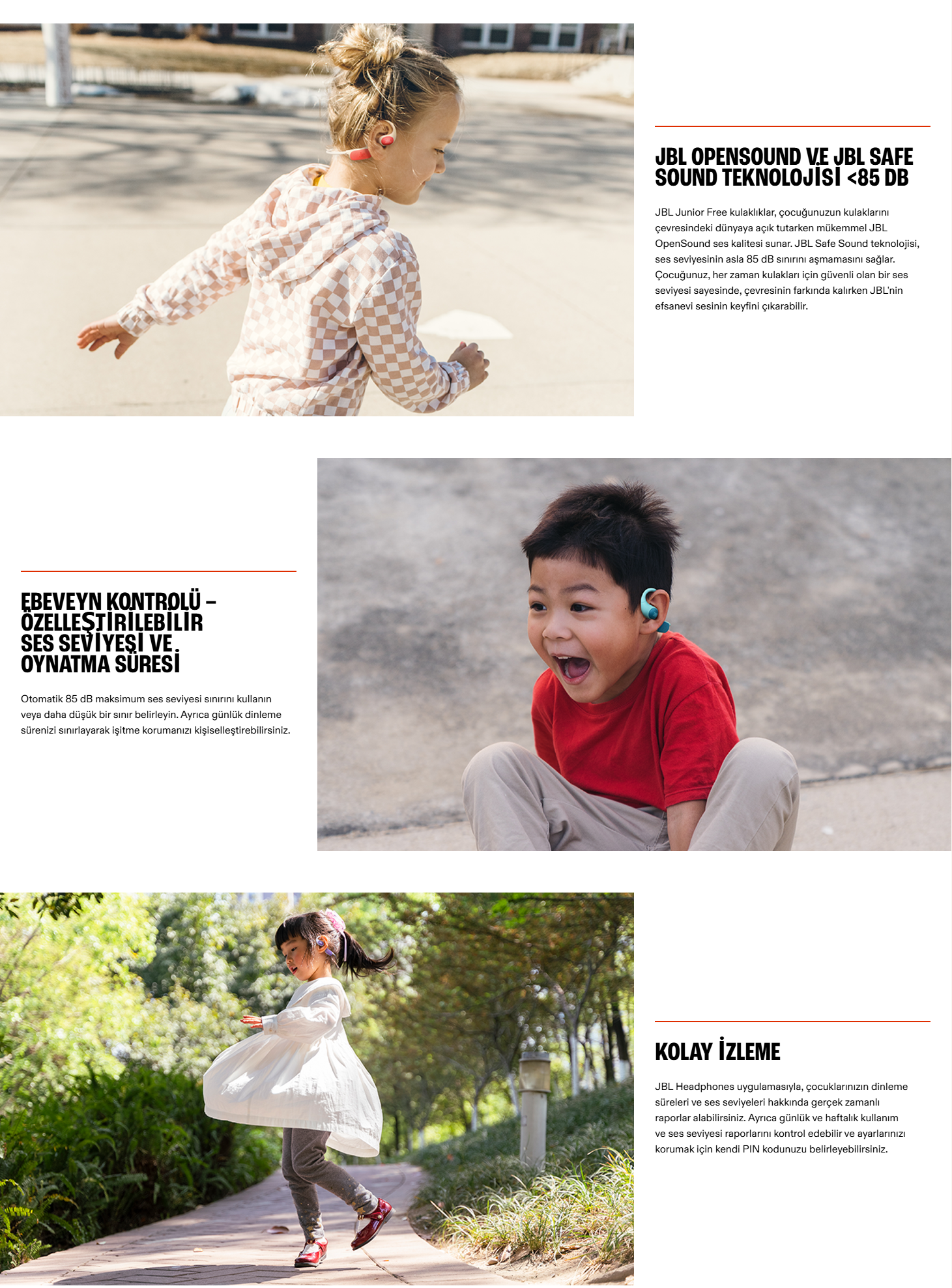 JBL Junior Free kablosuz açık kulaklıklar, JBL OpenSound sesini güvenli ve ebeveyn onaylı ses seviyelerinde yeni bir nesle taşıyor. Kulaklıklar çocukların kulaklarını korumak için tasarlanmıştır. Ses seviyesi 85 dB'yi aşmaz ve kulaklıklar kulak kanalını tıkamaz, böylece çocuklar çevrelerindeki dünyadan haberdar olmaya devam edebilirler. JBL Kulaklık uygulamasıyla, özel ses sınırları belirleyebilir, günlük dinleme süresini yönetebilir ve çocuğunuzun dinleme alışkanlıkları hakkında ayrıntılı haftalık veya günlük raporlar alabilirsiniz. Yumuşak silikondan yapılmış ve boyun bandıyla donatılmış Junior Free kulaklıklar, konfor, stabilite ve bağımsız kullanım için tasarlanmıştır. Büyük ve dayanıklı düğmeler, küçük parmaklara uyacak şekilde tasarlanmıştır. 10 saate kadar pil ömrü, evde veya hareket halindeyken uzun süreli eğlence anlamına gelir. Kulaklıklar eğlenceli renklerde gelir ve küçük rock yıldızlarının kulaklıkları kendi tarzlarına göre kişiselleştirebilmeleri için bir JBL çıkartma seti içerir. Harika sesin yaş sınırı yoktur.