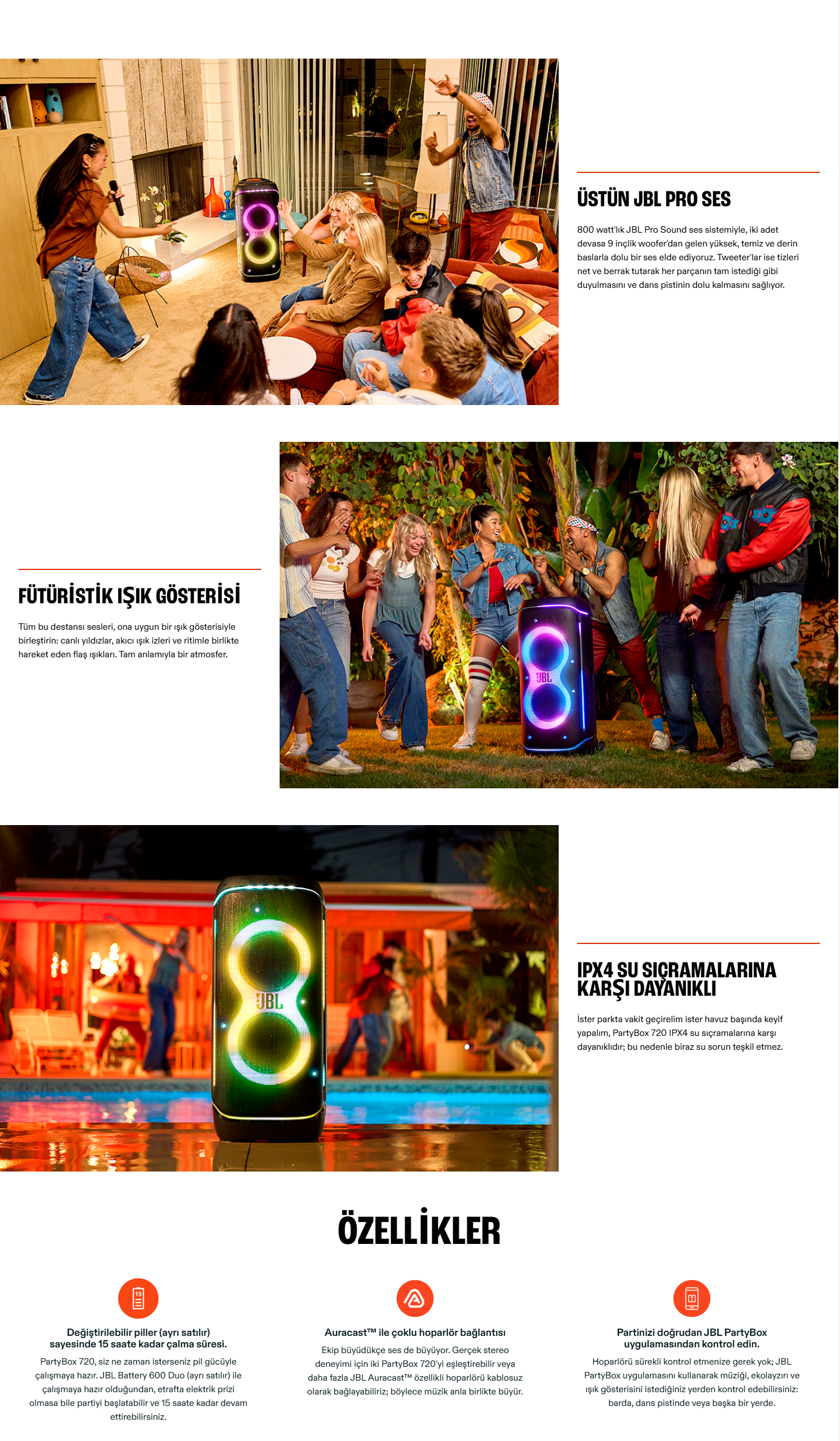 JBL PartyBox 720 ile gittiğimiz her yere en yüksek parti enerjisini taşıyoruz. Üstün JBL Pro Sesi, tam kıvamında derin baslar ve yıldız ışıkları, akan izler ve titreşen flaşlar içeren muhteşem bir ışık gösterisi. Pürüzsüz tekerlekleri, sağlam tutacağı ve su geçirmez tasarımıyla partiyi gittiğimiz her yere taşıyoruz.