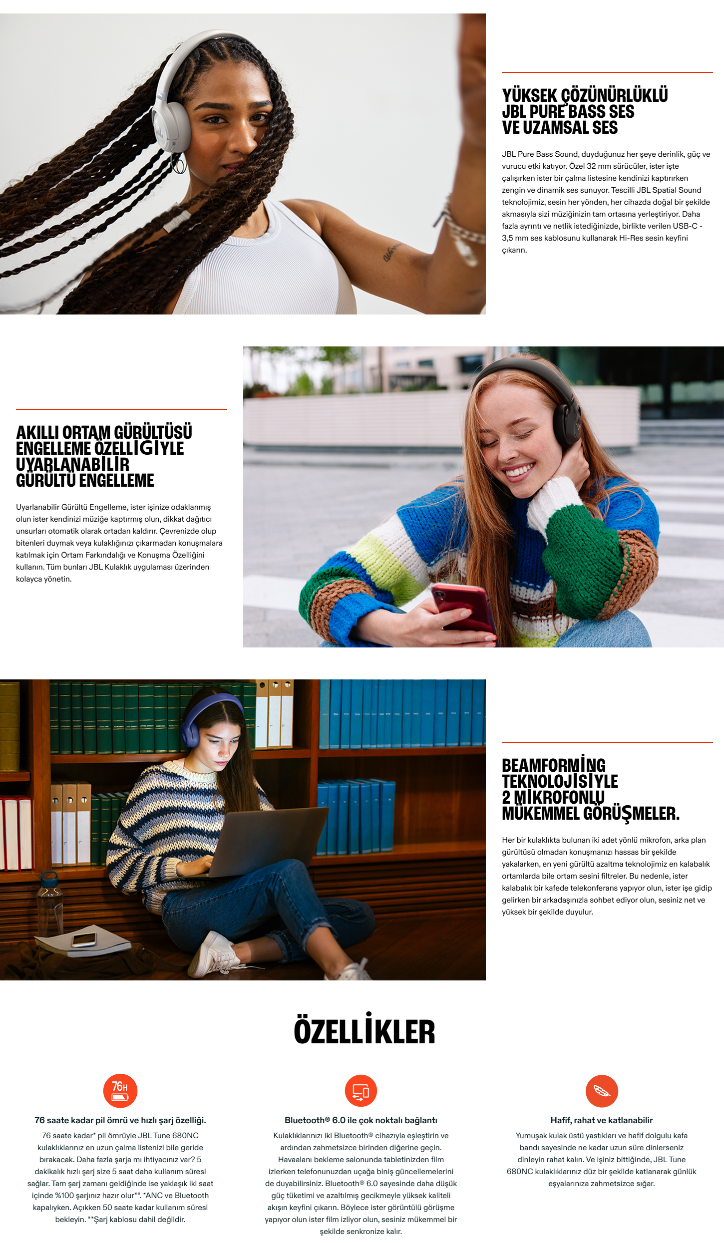 JBL Tune 680NC kablosuz kulaklıklarla müziğiniz ön plana çıkıyor. JBL Pure Bass Sound ve etkileyici Spatial Sound, sizi net ve güçlü müzikle sararken, Adaptif Gürültü Engelleme özelliği sizi dikkat dağıtıcı unsurlardan uzak tutuyor. Zarif metal detaylara sahip kulak üstü tasarımı, şık renk seçenekleriyle dikkat çekiyor. 76 saate kadar pil ömrü, şarjlar arasında bir hafta geçirebileceğiniz anlamına geliyor. Ve eğer şarj etmeniz gerekirse, 5 dakika içinde 5 saat daha kullanabilirsiniz veya müziğe ara vermeden devam etmek için çıkarılabilir kulaklık kablosunu takabilirsiniz. Sesinizi doğru bir şekilde algılayan 2 mikrofon sayesinde, aramalar her iki uçta da mükemmel duyuluyor. Sorunsuz Bluetooth® geçişi, cihazlar arasında bağlantıda kalmayı kolaylaştırırken, JBL Kulaklık uygulaması müziğinizin sesini ve kristal netliğindeki aramalarınızı kolayca özelleştirmenizi sağlıyor. Tüm gün takılabilecek kadar hafif ve müzik bittiğinde herhangi bir çantaya kolayca sığacak şekilde katlanabilirler. Sabah podcast'lerinden gece boyu dinlenen çalma listelerine kadar, JBL Tune 680NC kulaklıklar hem size ayak uydurmak hem de öne çıkmak için tasarlandı.