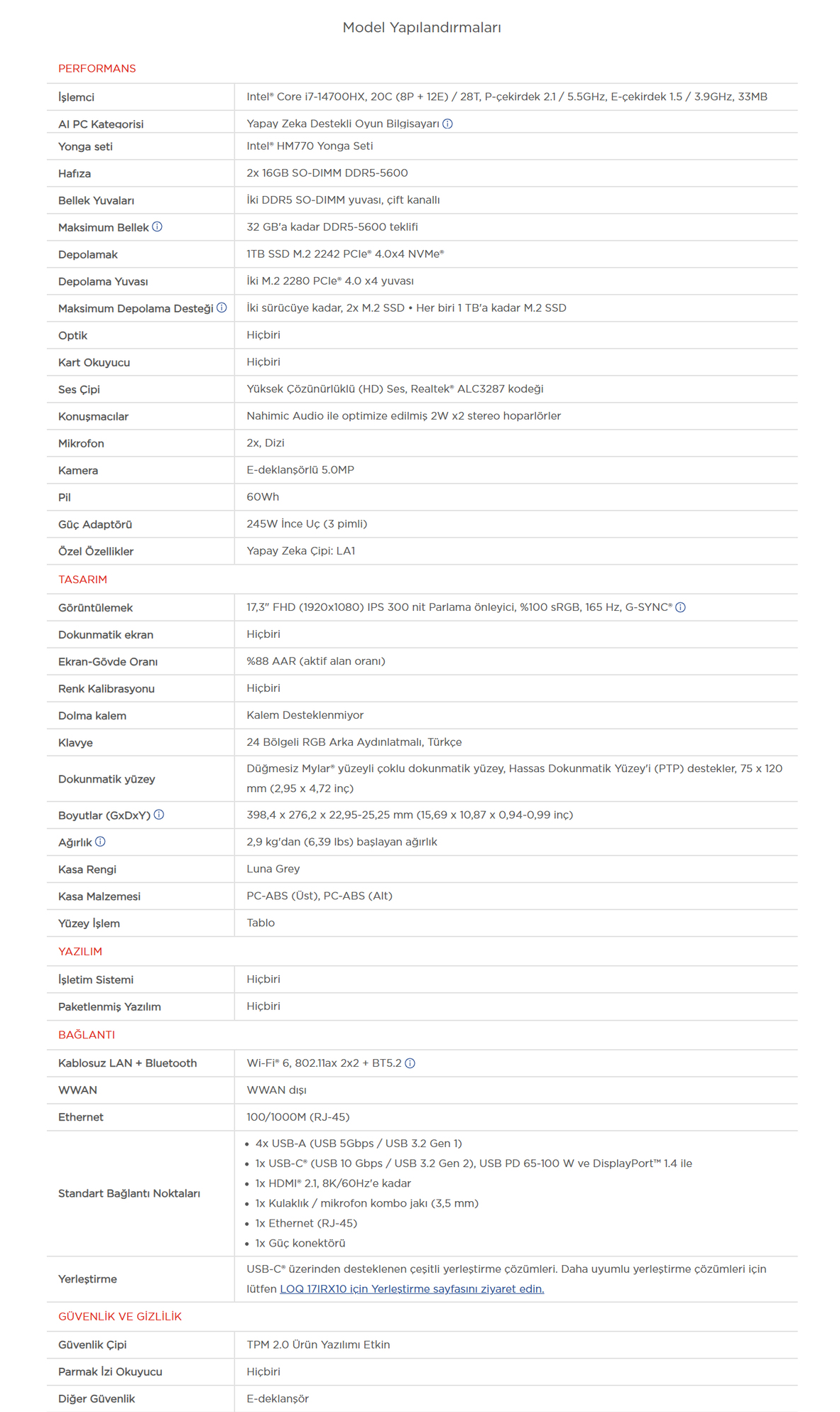 Lenovo Loq 17IRX10 Intel Core I7-14700HX 32GB 1tb SSD Geforce Rtx 5070 8gb (115W) 17.3'' Fhd IPS Panel 165Hz Freedos Taşınabilir Bilgisayar 83JH00BCTR (199272751250)