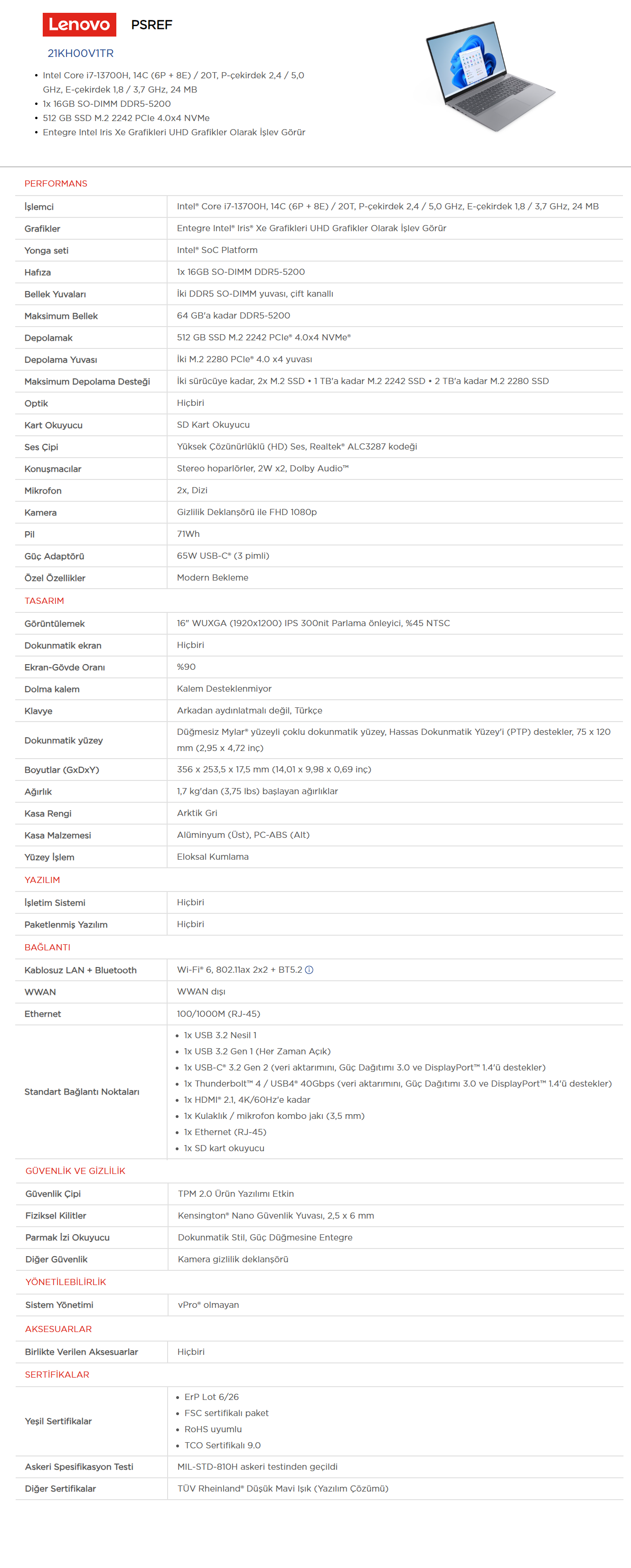 Lenovo ThinkBook 16 G6 IRL Intel Core i7-13700H 16GB 512GB SSD 16'' WUXGA IPS Panel Freedos Taşınabilir Bilgisayar 21KH00V1TR (198155698323)