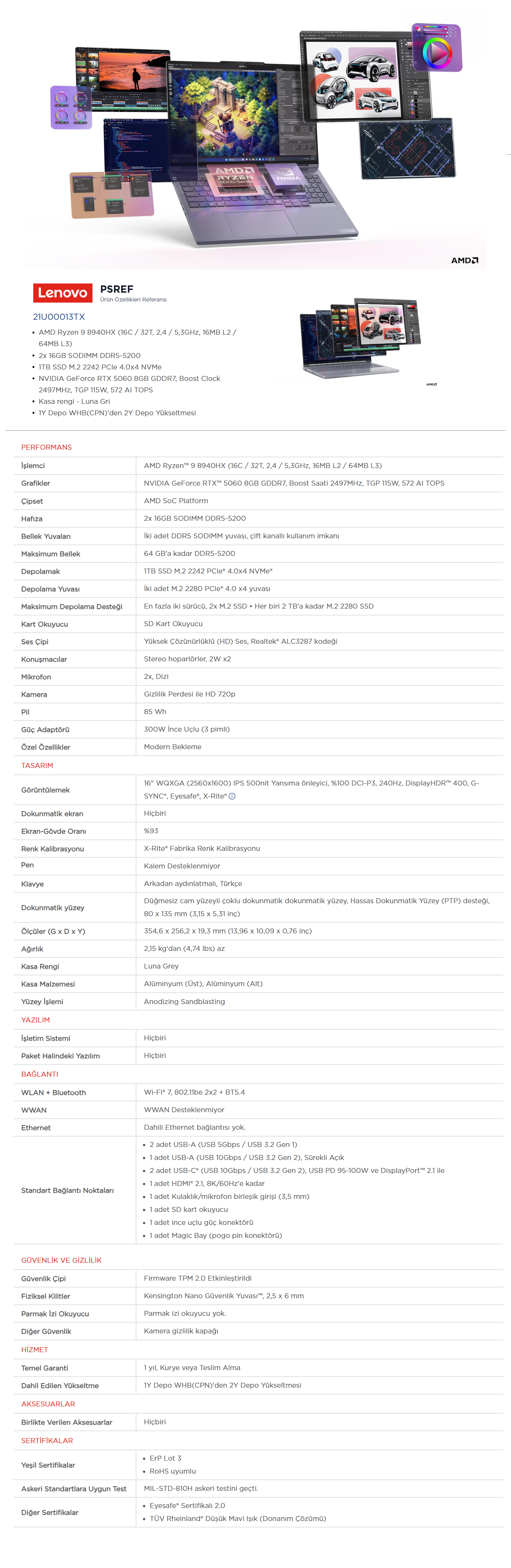 Lenovo ThinkBook 16p G6 ADR 32GB 1TB SSD RTX 5060 8GB (115W) 16'' 2.5K WQXGA (2560x1600) IPS Panel 240Hz Freedos Taşınabilir Bilgisayar 21U00013TX (199271328941)