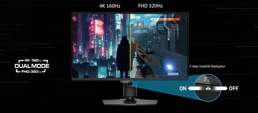 Çift Mod, oynadığınız oyun için en uygun çözünürlük ve yenileme hızını seçmenizi sağlar—hızlı FPS oyunları için düşük çözünürlükte daha yüksek yenileme hızını, ya da net 4K görseller için daha düşük yenileme hızını tercih edebilirsiniz. Kullanıcı odaklı ergonomik tasarımıyla 5 yönlü Joystick Navigator ve tek tıkla geçiş düğmesi sayesinde Dual Mode ayarlarını kolayca değiştirebilir, kullanıcı dostu bir deneyim yaşayabilirsiniz.