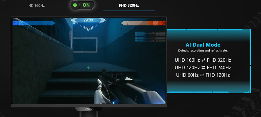 MSI tarafından özel olarak geliştirilen AI destekli Çift Mod, mevcut çözünürlük ve yenileme hızını otomatik olarak algılar, çözünürlük değiştirildiğinde en uygun yenileme hızına geçer. Windows ayarlarını değiştirmeye gerek yok! Oyuncular artık çözünürlük geçişleri hızla yapabilecekler.