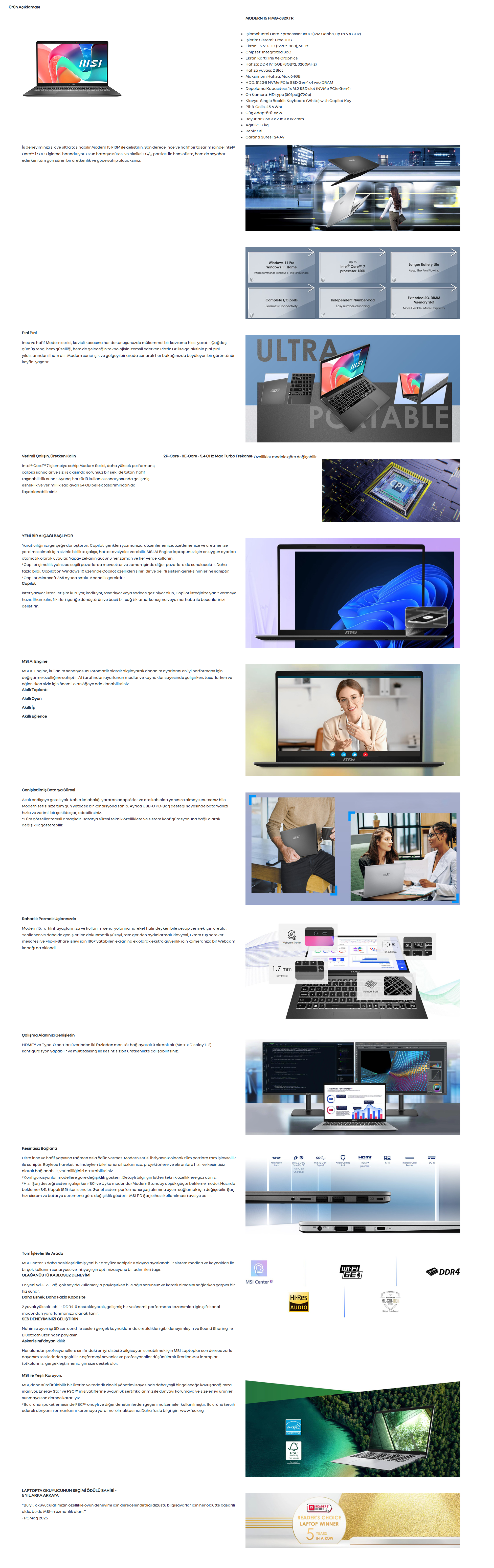 MSI NB MODERN 15 F1MG-632XTR CORE 7 150U 16GB DDR4 UMA 512GB SSD 15.6 FHD DOS GRI (4711377342469)
