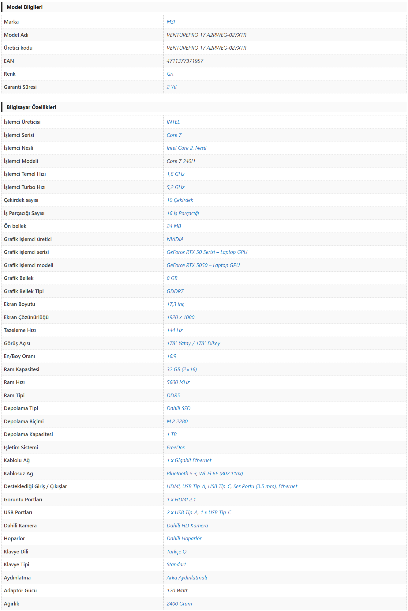 MSI NB VENTUREPRO 17 A2RWEG-027XTR CORE 7 240H 32GB DDR5 RTX5050 GDDR7 8GB 1TB SSD 17.3 FHD 144Hz DO