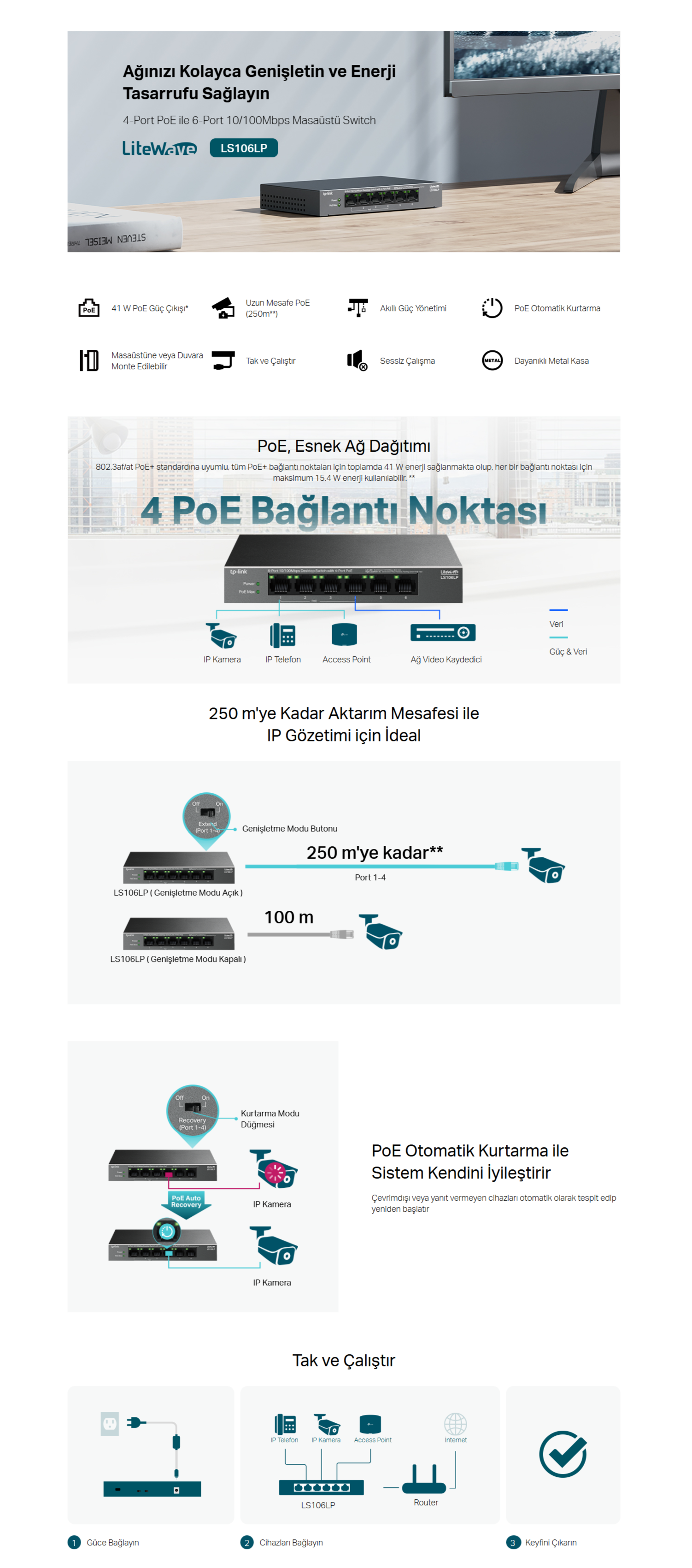 TP-Link LS106LP, Green Tech, 6 Port, Megabit, 4 Port Poe, Metal Kasa, 41W, Yönetilemez, Masaüstü Switch