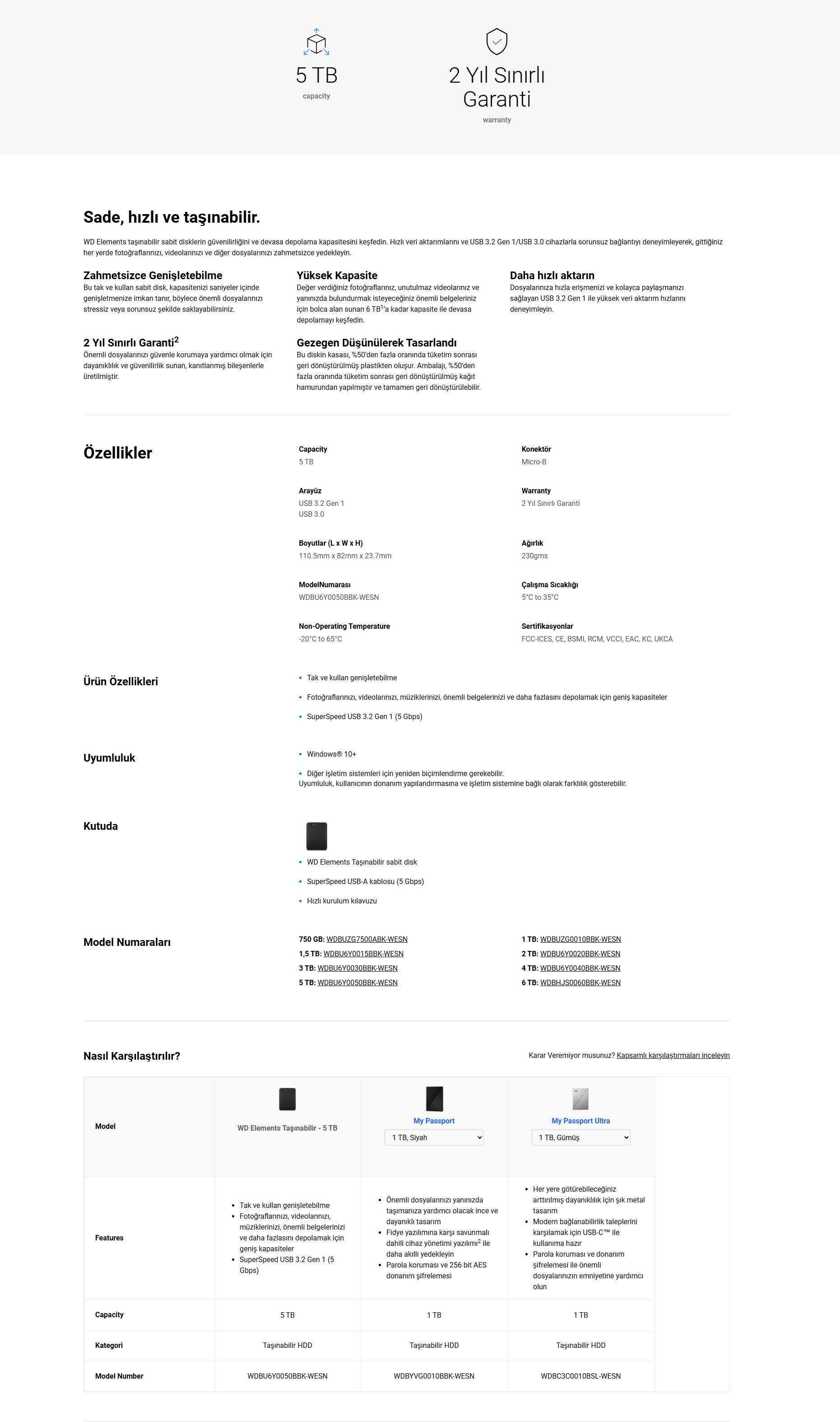 WD WDBU6Y0050BBK-WESN Elements 5 TB 2.5'' USB 3.0 Taşınabilir Disk Siyah (718037871899)